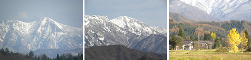 オーナー自ら案内して頂いた席は冠雪した「八海山」の山並みが真正面に広がる